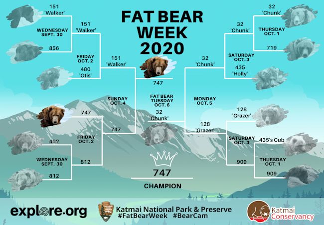 Far Bear Week takes place from Sept. Youve crowned the Earl of Avoirdupois bear 747 the 2020 Fat Bear Week Champion. A total of 12 bears participated in this years March-madness style competition that ran from September 30 through today but in the end there could be only one.